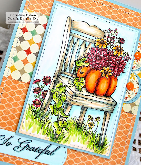Oh, Christine, this is gorgeous, and I really do love this chair with the pumpkin...and love that trailing vine! Beautifully colored...you always delight me! And what perfect DP and great layout! Stunning, and I am really excited about the sentiments with the pretty font! Hugs, my friend!
