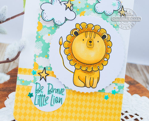 Hello! This week I’m planning a little fun with baby themed cards, and today we’re starting it all off with the new releases from The Cat’s Pajamas! I just love the sweet images in the new set, I’m Not Lion, and I saw baby cards in my head as soon as Alma showed it to us. I’ve coloured this cute little guy in golden yellows and paired it with these great patterned papers that match perfectly.