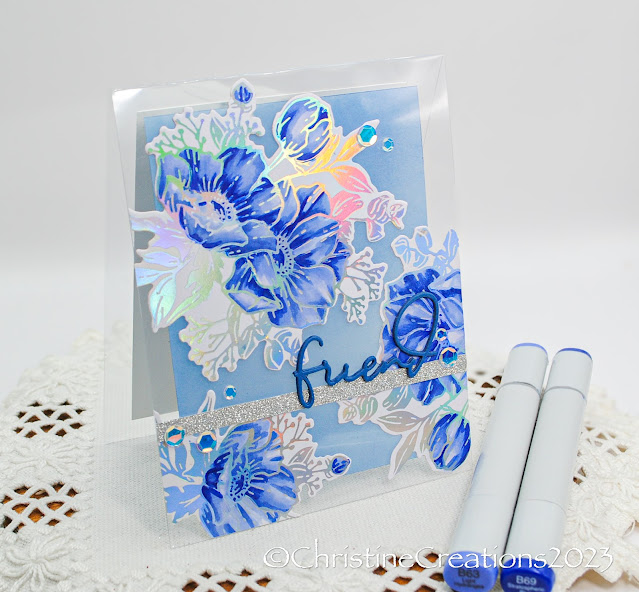 Hello! And happy new week! Today I’ve dabbled with some beautiful anemone flowers a clear cardstock to bring a lovely friendship card. I began with Spellbinders Anemone Glimmer Blooms set, foiling the flower image twice, using the coordinating die to cut it out.